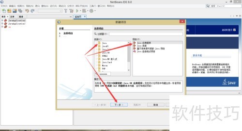 1、 首先创建项目,启动Netbeans IDE 8.0,依次选择文件菜单中的新建项目,在类别中选择Java,项目类型选Java应用程序,点击下一步,最后确认完成创建,具体操作所示。