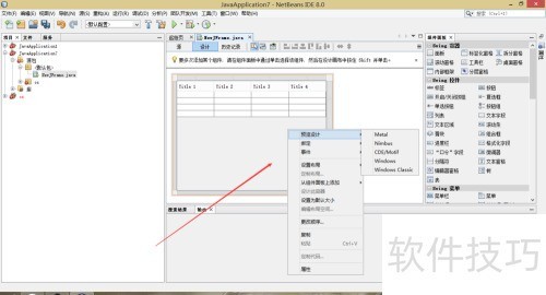 4、 完成上述操作后,将生成.java文件。右键点击右侧控件并拖拽至面板中即可添加;选中已拖入的控件可设置其属性;通过窗体上方的选项,可在设计界面与代码视图间自由切换,具体所示。