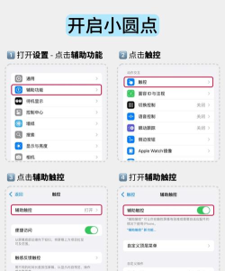 打开设置,找到“辅助功能”这个选项,点进去之后,往下滑动,找到“触控”这一项,在触控菜单里,第一个就是“辅助触控”,点进去之后,你会看到一个开关,把它从灰色变成绿色,就打开了,这时候,屏幕上立刻就会出现一个半透明的小圆点,你可以用手指拖动它,放到你觉得顺手的位置。