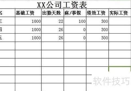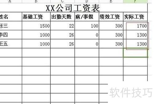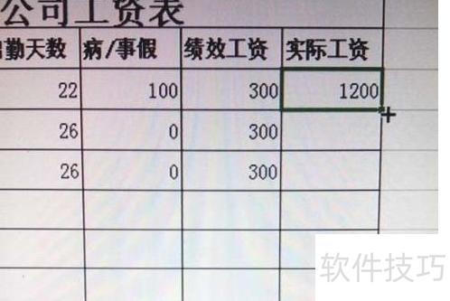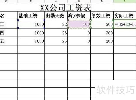 在该工资表中需运用加法与减法两个运算公式。首先,用鼠标点击实际工资对应的结果单元格,接着按下键盘上的=键,此时该单元格会出现一个=符号。随后,点击参与相加的两个数据单元格(如基础工资和绩效工资),并在其间按一次键盘上的+号,表示执行加法操作,结果单元格将自动显示这两个数值所在位置的代码(例如B3+E3)。完成加法后,再按下键盘上的?号,表示接下来进行减法运算,然后用鼠标点击需扣除项(如病事假扣款)对应的单元格,即可完成整个公式的输入。