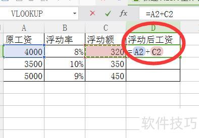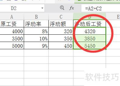 4、计算浮动后工资,输入公式:=A2+C2,用原工资加浮动金额得出新工资。