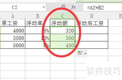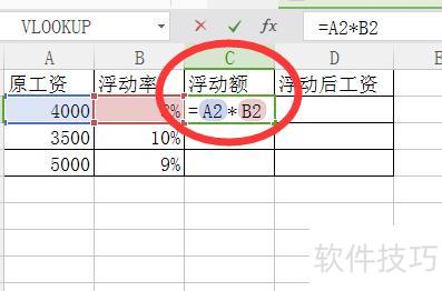 在C2单元格输入公式:=A2*B2,计算原工资与浮动率相乘后的浮动额。