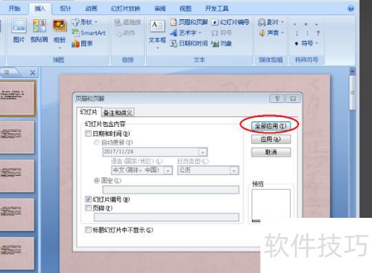 首先,打开已创建的Powerpoint2003文件,为每张幻灯片添加编号(类似于Word中的页码)。依次选择插入菜单中的幻灯片编号,勾选幻灯片编号选项,最后点击全部应用,即可为所有幻灯片统一添加编号。