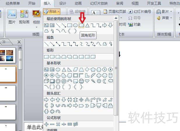 在形状下拉菜单中选择圆角矩形并点击。
