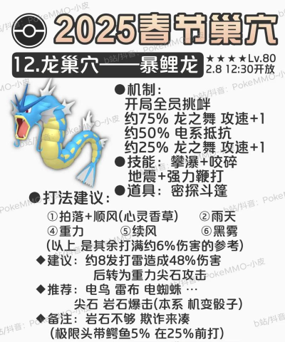 暴鲤龙上场时机,其实很有讲究,最好不要首发,因为容易被针对,比如遇到电系,就很危险,所以,最好等对手,电系技能用过了,或者电系宝可梦,被处理掉了,再上场,上场后,如果机会好,可以先龙舞,强化一下自己,然后,再开始推队,如果对手有电系,要小心,可以用地震先读,或者直接换下场,要灵活,不能硬拼。