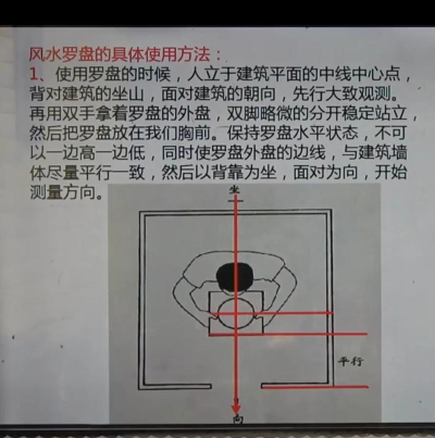 校准好后,就能测方位了,比如,你想测房子的朝向,就站在屋内,面对大门,把罗盘端平,然后,看红色指针,指向哪个字,那个字就是朝向,比如指向“午”,就是正南,多练习几次,你就会很熟练。