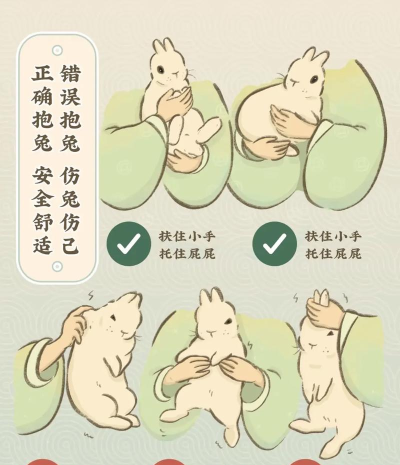 一只手托住前胸,另一只手托住屁股,像个小摇篮,把它身体贴紧你,别让它悬空,兔子后腿有力,悬空会乱蹬,容易伤到脊椎,抱稳了再起身。
