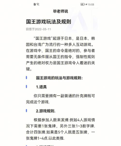 再看基本规则每人抽一张牌,抽到特殊牌的人,就是“国王”,比如,可以规定抽到红桃K,国王身份要保密,国王可以命令,任何两个号码做事,号码对应抽到的牌。