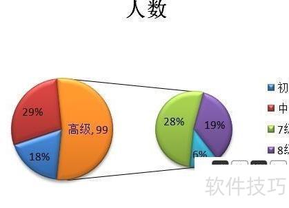 现有数据需用饼图展示各级别人数,并突出显示高级中7、8、9级的详细人员分布,应如何设计该饼图?