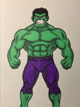 接着是第三步,刻画头部与表情,绿巨人的头相对身体较小,但下巴方正,眉骨突出,表情永远是愤怒的,眉头紧锁,嘴巴张开怒吼,甚至露出牙齿,画眼睛时,瞳孔要小,显得凶狠,别忘了那一头乱发,可以画得狂野不羁,增加野性感觉。