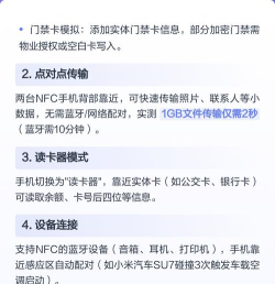 再看nfc能做什么nfc的用途,其实比你想象的多,最常见的就是移动支付,比如用手机刷公交卡,或者用手机支付,代替实体银行卡,它还能当门禁卡用,模拟小区的门禁,让你不用带卡,也能开门回家。