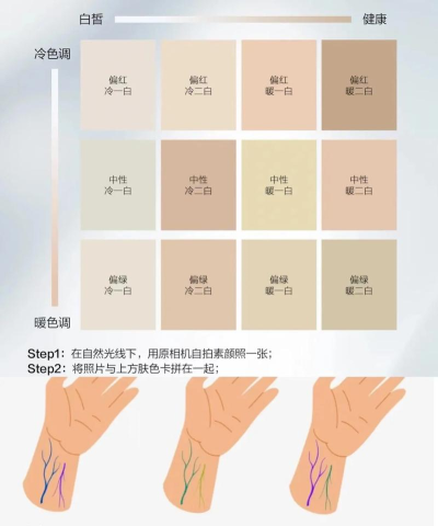你可以看看手腕内侧,这里的血管颜色,是个好参考,如果血管偏蓝紫色,那么,你可能是冷色调肤色,如果血管偏绿色,那么,你可能是暖色调肤色,如果蓝绿都有,或者分不清,那么,你可能是中性色调肤色。