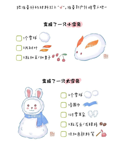找两颗石子当眼睛,一根胡萝卜当鼻子,树枝当手臂,帽子围巾不能少,这些是灵魂,让雪人活起来,发挥你的创意,用纽扣,或者围巾,打扮你的雪人,拍照留念,分享快乐。
