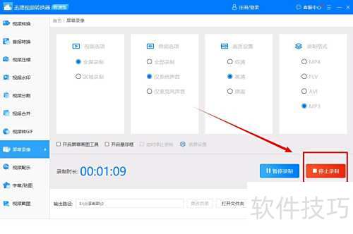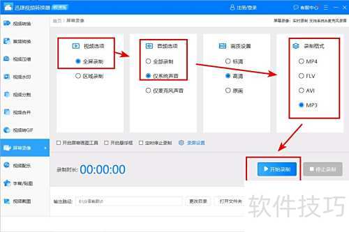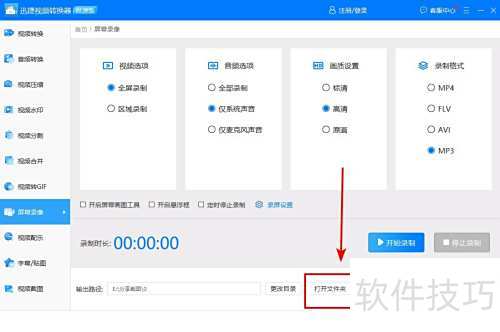 2、 选择全屏录制模式,音频仅采集系统声音,格式设为mp3,随后点击开始录制即可。