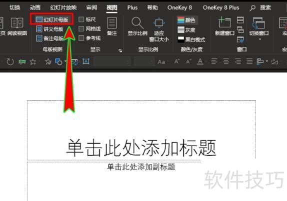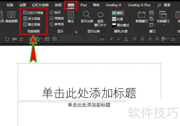 进入软件后,点击顶部菜单栏的视图,在下拉列表中找到并选择母版视图选项组。