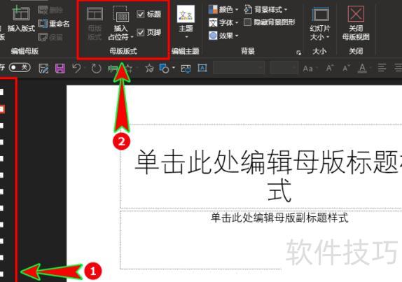 进入幻灯片母版后,先在左侧选择喜欢的内置版式,再于顶部菜单栏中找到母版版式选项组即可完成设置。
