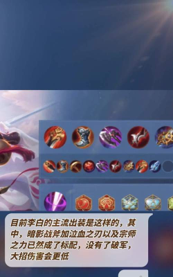 李白的核心输出装,一般是暗影战斧和破军,暗影战斧要先出,它能提供攻击力,冷却缩减,还有物理穿透,这些属性李白都很需要,出了暗影战斧之后,李白的伤害会有明显提升,刷野和抓人都会舒服很多,然后就可以做破军了,破军的被动,对残血敌人伤害更高,配合李白的大招,收割能力非常强。