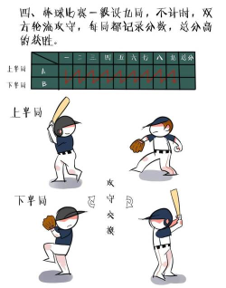 棒球场地,是扇形的,本垒、一垒、二垒、三垒,组成一个菱形,防守方有九个人,投手、捕手、内野手、外野手,进攻方则轮流上场击球。