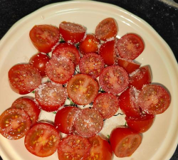 接着是调味,这是灵魂所在,白糖是主角,量要放足,撒在西红柿上后,轻轻拌匀,让每一片都沾上糖粒,然后静置十分钟,等糖慢慢融化,渗入西红柿里,这样才会酸甜多汁,如果马上吃,糖还是颗粒状,味道就不融合。