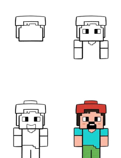 史蒂夫也是方块人,先画一个长方形的头,接着画方形的身体,手臂和腿都是长方形,连接处要自然,别忘了画他的表情,眼睛是两个小方块,嘴巴是一条短线,这样看起来就像了。