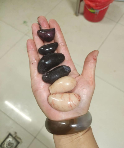 拔完毛,就要开膛了,用刀从鸡的肛门处,向上划开一条口子,一直划到脖子下方,然后,把手伸进去,把内脏掏出来,掏的时候要小心,别把苦胆弄破了,不然鸡肉会发苦。