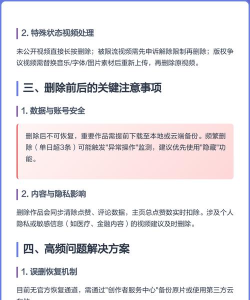 最后看删除的注意事项删除作品前,一定要三思,特别是那些,数据还不错的视频,删了可能影响账号权重,还有,如果视频有商业合作,或者重要的纪念意义,最好先备份,再删除,另外,删除操作是不可逆的,服务器上也会清除,所以,没有后悔药可以吃,如果只是觉得封面不好,或者文案有问题,其实可以重新编辑,不一定非要删除。