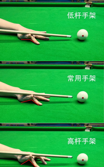 架杆手是球杆的支点,必须稳固,常见的架杆方式有几种,比如开放式、封闭式,对于新手来说,可以先学开放式,把手掌平放在台面上,拇指翘起贴住食指,形成一个V形槽,球杆就放在这个槽里,这样架杆比较稳定,也容易找到瞄准的感觉,记住,架杆手要压稳,不能晃动。
