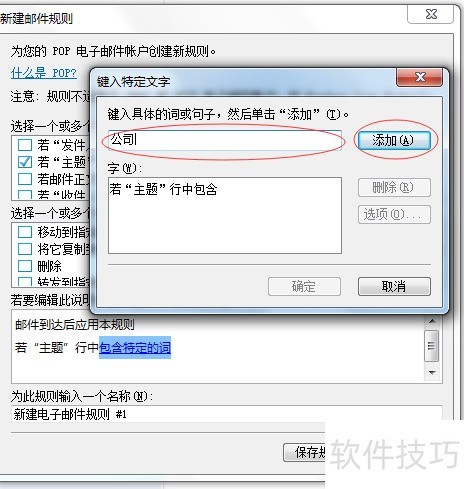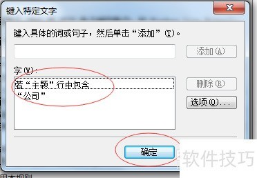 5、 点击包含特定的词后,将弹出新的设置窗口,所示。在标红区域输入你希望识别的关键词,此后只要收到的邮件主题中包含该词,系统便会自动进行归类转移。此步骤非常关键,关键词设置准确与否直接影响分类效果。以公司为例,今后邮件标题中只要出现公司二字,便会自动进入指定文件夹。务必仔细填写,确保规则生效。