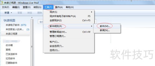 2、 在Windows Live Mail菜单栏中,点击工具,然后选择邮件规则下的邮件选项,具体位置可参考下图标注的红色框区域。