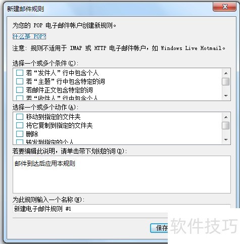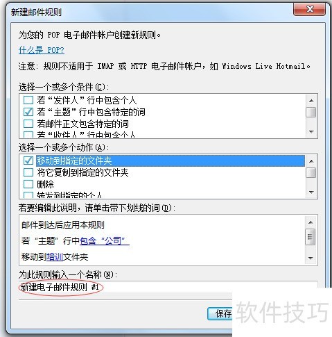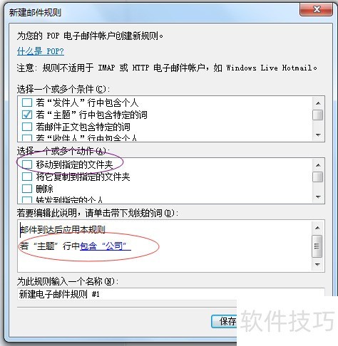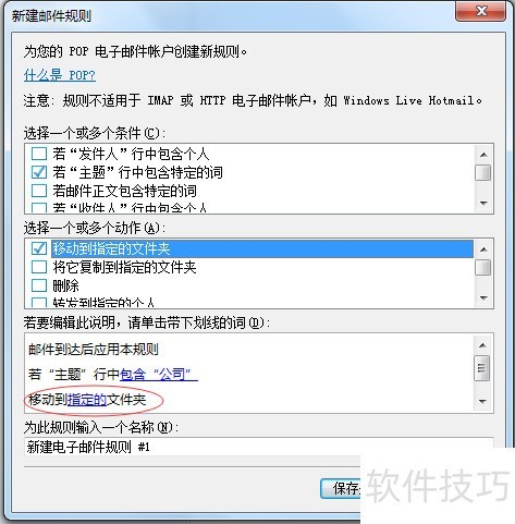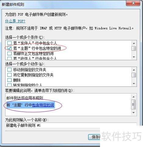 3、 在弹出的新建邮件规则窗口中,即可开始设定规则。选择若发件人包含特定人员,可将某人发送的邮件自动归入指定文件夹。本文以若主题包含特定词语为例进行说明,其他规则设置方法类似,均可依此操作流程逐一配置,实现邮件的自动分类与管理,提升处理效率。