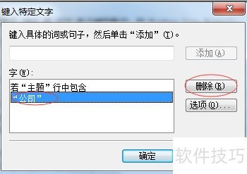 6、 输入公司后点击添加,操作1所示,界面将显示图2效果,确认后即完成关键字设置。若需修改,只需选中公司,此时删除按钮变为可用,删除后重新输入新关键字即可,具体操作可参考图3。