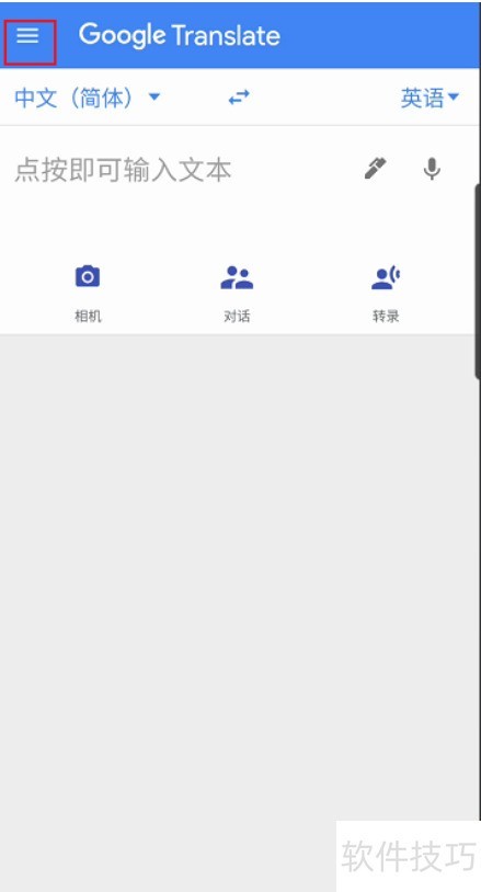 1、 进入谷歌翻译首页,点击左上角三条横线图标即可操作。