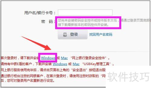 3、 首次进入登录页面时,会发现密码框无法输入,提示尚未安装密码安全控件。请根据提示点击Windows或Mac选项,下载并安装网上银行登录安全控件以完成设置。