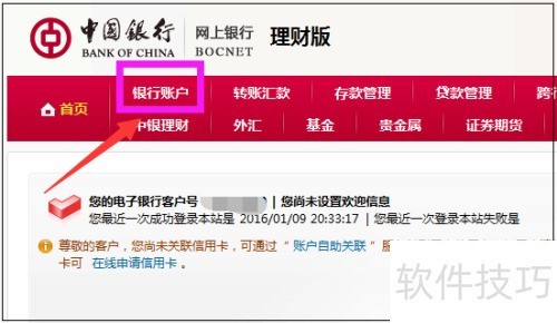 5、 登录后进入中国银行理财版网银首页,点击银行账户选项。