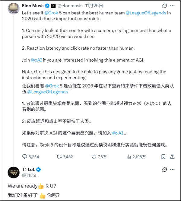 《英雄联盟》上演最强“人机对决“,T1战队与Grok 5 AI模型谁更胜一筹