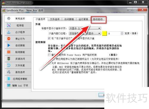 3、 在沙盘选项窗口的常规设置里,点击自动启动选项卡。
