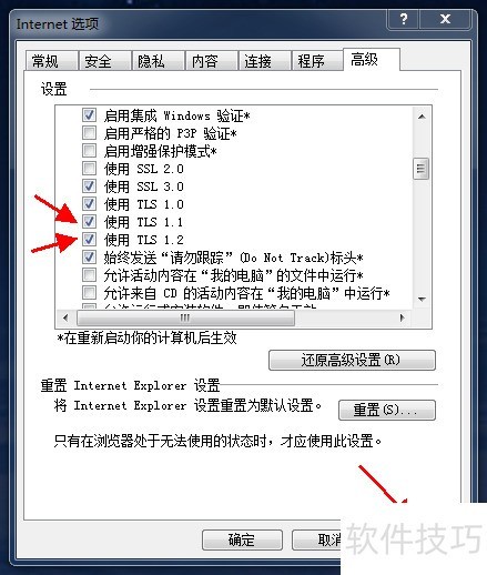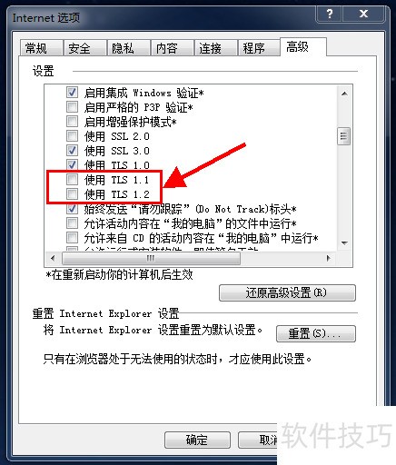4、 切换到选项卡,找到TLS 1.1/1.2协议,勾选协议前的复选框,最后点击应用按钮完成设置。