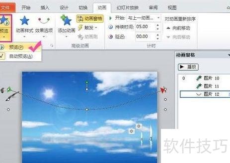 现已设置海鸟与帆船的动画,可点击动画选项卡中的预览按钮查看效果。由于两者的动画开始时间均设为与上一个动画同时,因此在播放时,海鸟和帆船的动画将同步呈现。
