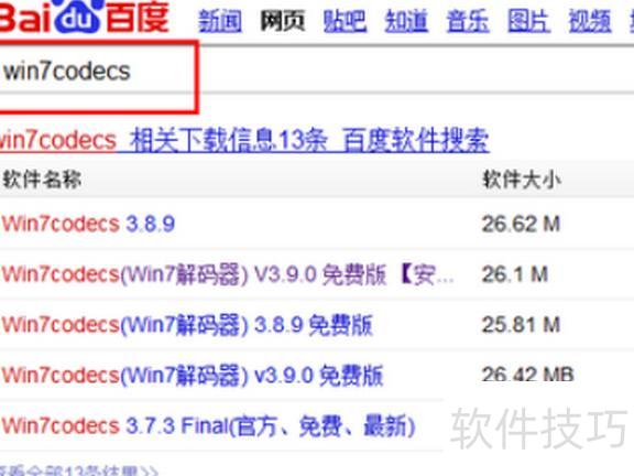 在网络搜索框输入win7 codecs进行搜索,从结果中找到视频解码器下载链接,点击任意链接即可下载安装。
