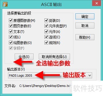2、 点击保存后,会弹出ASCII输出设置,将所有参数全部选中输出,文件版本选择最低的Pads Logic2005进行输出。
