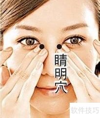 2、 按揉睛明穴:以大拇指轻按位于鼻根部靠近两眼内眦的睛明穴(左右各一),先向下按压,再向上提挤,一按一挤为一次,共做64次。此法可缓解目赤肿痛、迎风流泪、内外翳障、青盲、夜盲、色盲、近视等问题,还对急慢性结膜炎、泪囊炎、角膜炎、电光性眼炎及视神经炎有辅助疗效。