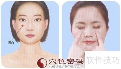 3、 按揉四白穴:双手大拇指置于下颌骨凹陷处支撑,食指按于面颊中部的四白穴(正视时,瞳孔直下,眶下孔凹陷处)。其余手指收拢,以旋转方式按揉,一圈为一拍,共64拍,每8拍变换一次旋转方向。
