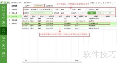 6、 出库明细查询功能可查看出库单号详情。进入页面后,双击目标记录条,即可展示详细信息,方便进一步了解。