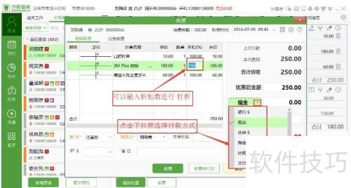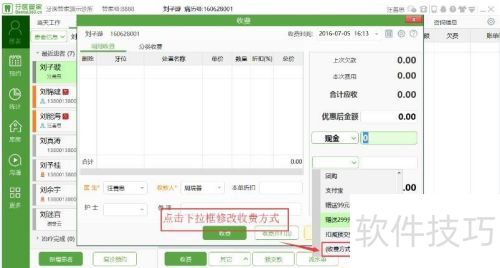 6、 在收费界面操作,于蓝色光标处修改折扣,点击付款方式下拉框能选择不同的选项。