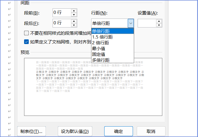 2、找到行距,点击单倍行距旁边的下拉按键。