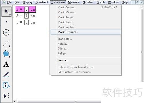 2、 打开几何画板软件,在数据中选择新建参数,新建a = 3、b = 4、c = 5且单位为距离的参数,接着选中参数a,于变换里执行标记距离。