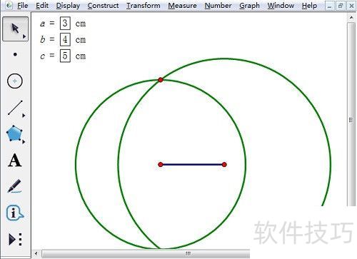 5、 4.选取长度为3的线段的一个端点与参数b,通过构造——以圆心和半径绘圆来画圆;再选中该线段的另一个端点与参数c,同样执行构造——以圆心和半径绘圆画圆,两圆交点即三角形第三个顶点。