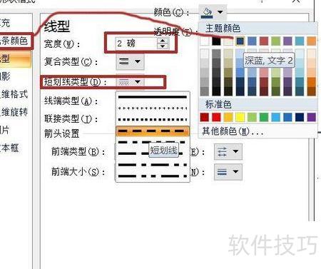 右键选择设置形状格式,线型设为短划线,宽度2磅,颜色选深蓝色。