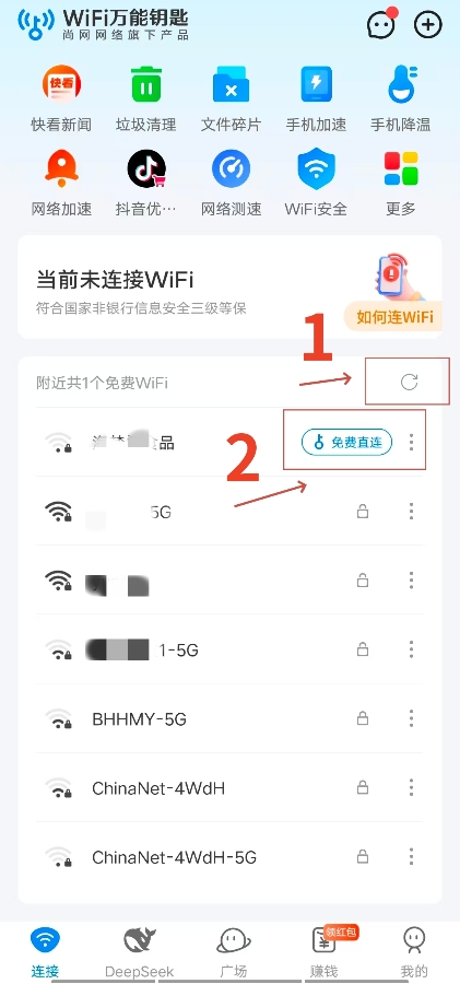2、打开页面后,首先点击刷新按钮,寻找可连接的网络,点击“免费直连”。
