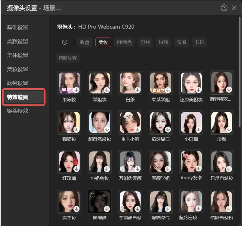 2、浏览并选择特效:从特效库中选择合适的特效素材(如美妆、PK整蛊、男神、扮靓节日氛围等)。